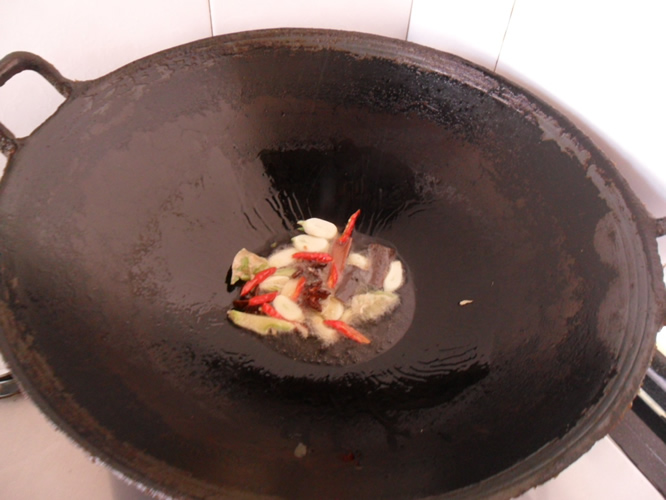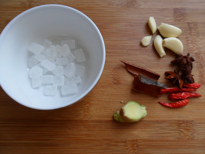 1准备冰糖一把,姜、干辣椒、八角、桂皮、大蒜