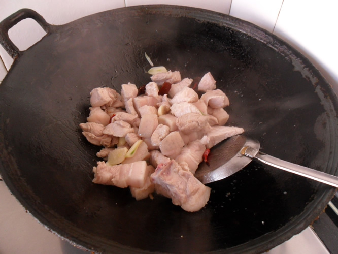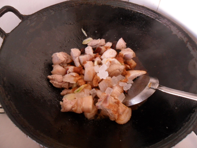 7翻炒片刻加老抽、少许醋、冰糖、盐、料酒