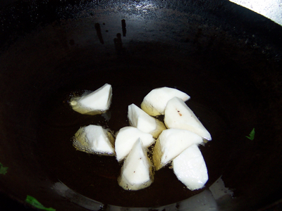 4把山药下入油锅煎成金黄捞出备用