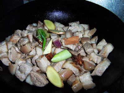 7加入葱姜和八角 桂皮 辣椒,继续煸炒至出香味,肉色微黄