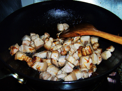 8加入冰糖转小火,煸炒至上糖色