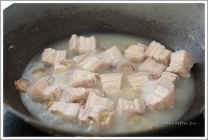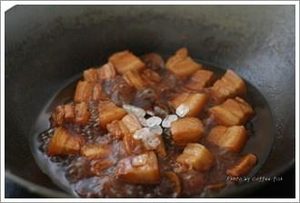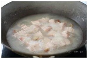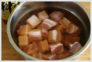 导读:将浸泡的五花肉和干山楂片放入锅里.加水.要没过肉块2寸