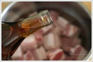4盆中加入凉水放入切好的五花肉.再加入一大勺料酒