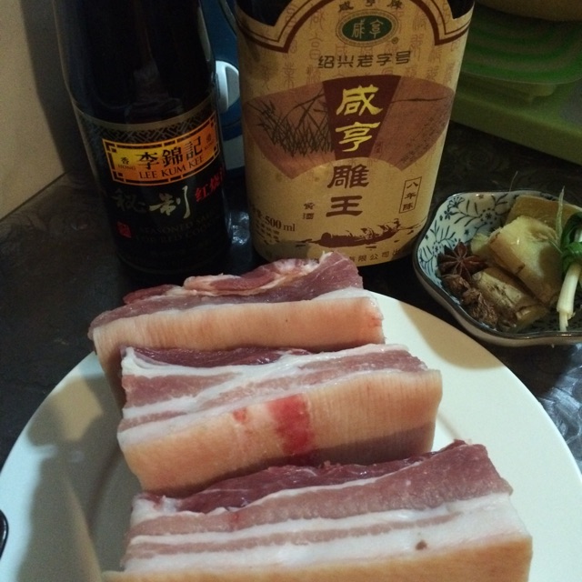 1 准备材料,五花肉, 花雕酒 ,秘制红烧汁,佐料等。