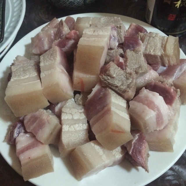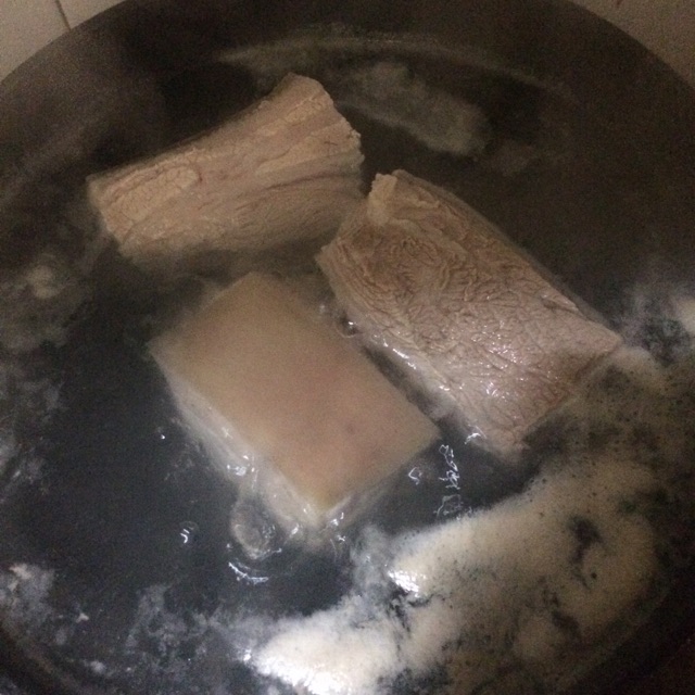 2肉洗干净冷水下锅焯水,煮开后捞出。整块下去的肉更容易定型,切出来的样子好看。