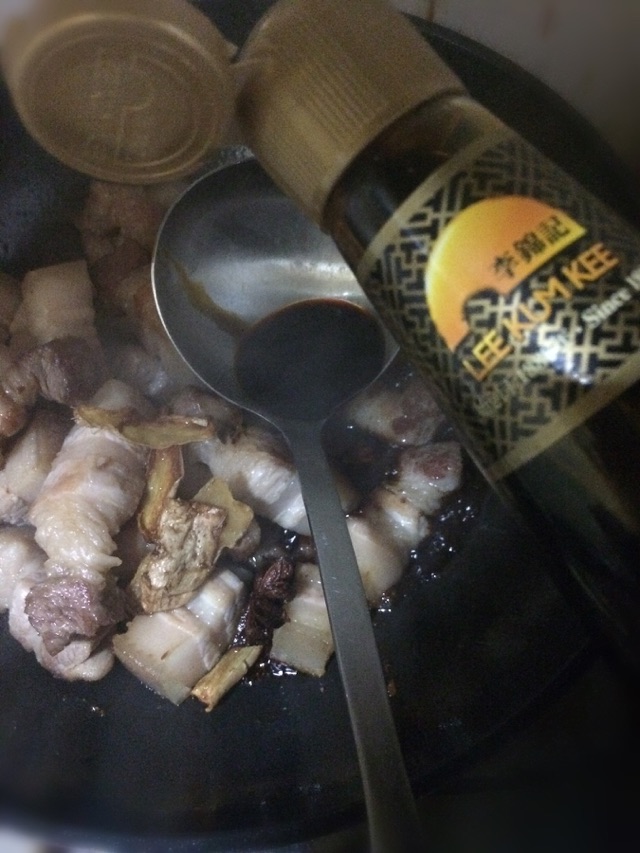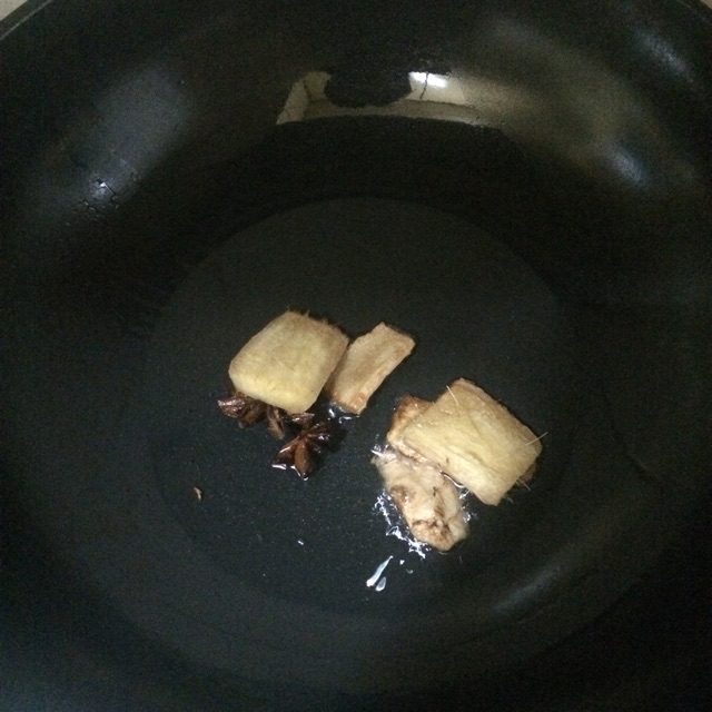 4油锅烧热,爆香八角与姜片。