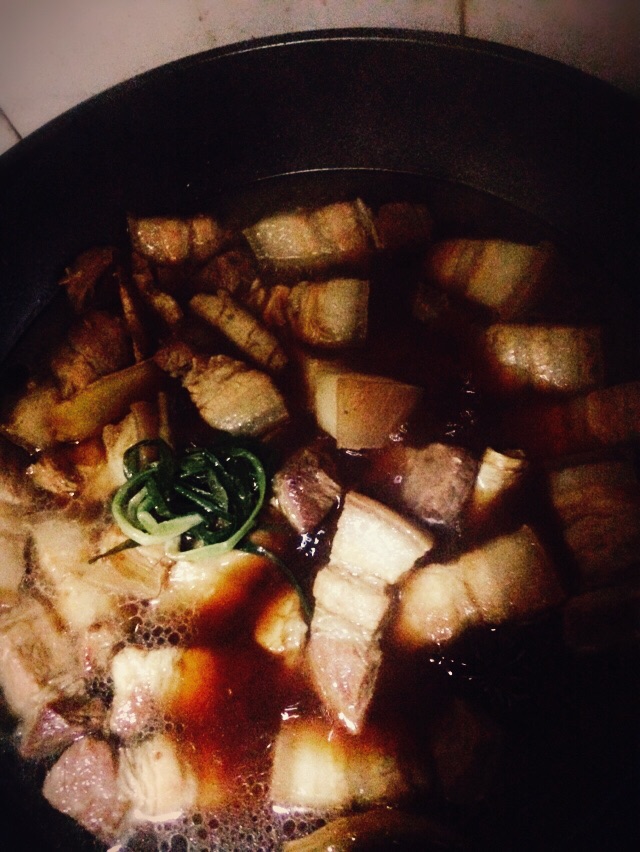 7加入热水,冰糖与葱结,大火烧开几分钟后转小火焖煮八十分钟,收汁起锅。喜欢咸口的朋友可不加冰糖,喜欢吃辣的朋友可以再放几个干辣椒下去,依个人口味适当调整。