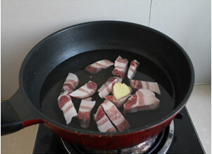 2五花肉冷水下锅,放一片姜,烧开水焯5分钟,焯掉血沫杂质。