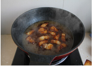 4放入焯好的五花肉,炒上色,多炒一会,把五花肉里面的油脂炒出来,吃起来不腻。