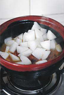 11待肉煮至六七成熟时(约40分钟),加入切块的白萝卜同煮