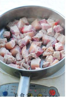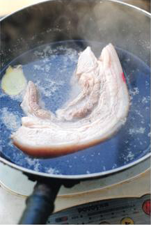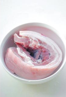 ◎五花肉先放料酒里浸泡可以去腥(也可以切块后浸泡),用水焯一下,去除表面的脏东西。