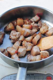 7倒入炒过的五花肉块,翻炒均匀。再加入料酒、生抽、老抽