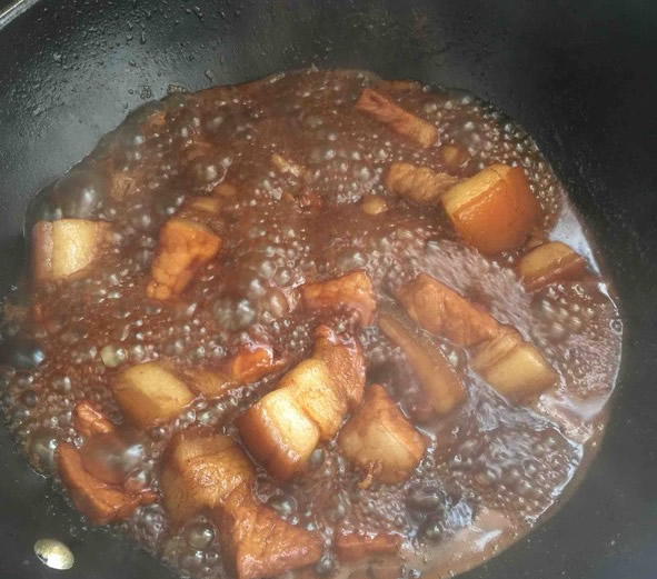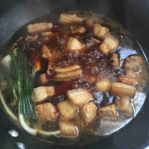 10五花肉都裹上糖色后加入加水,水量要没过肉,加葱段、姜片、盐1/2勺、生抽3勺、老抽2勺,翻炒均匀大火烧开后改小火炖30分钟(如果想肉再烂一些可以加长小火慢炖的时间)