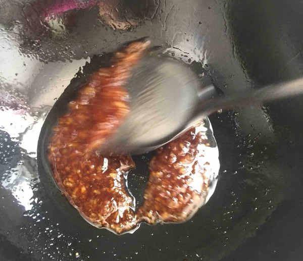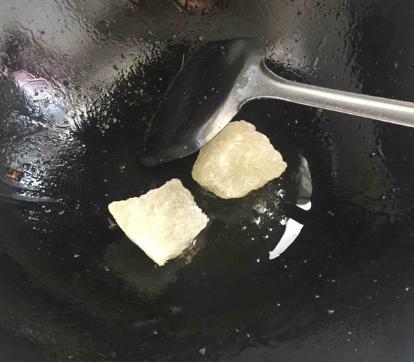7锅中放少许油,把冰糖放进去翻炒,要不停的翻动