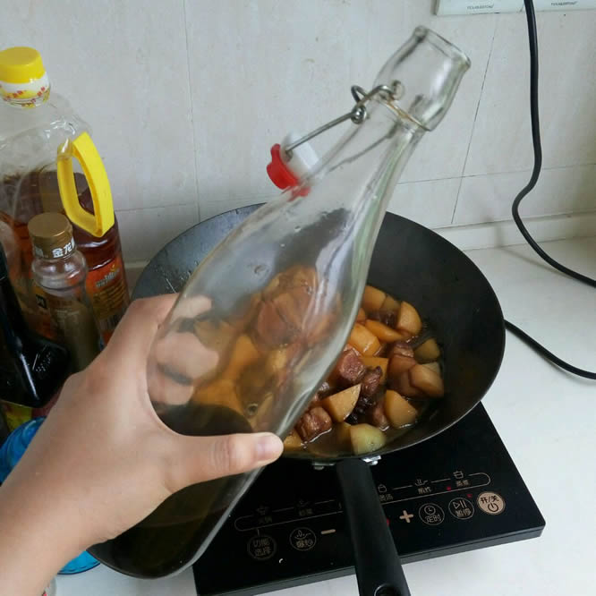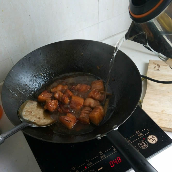 11 倒入开水,比没过五花肉的水量再多一点。因为一会还要炖土豆