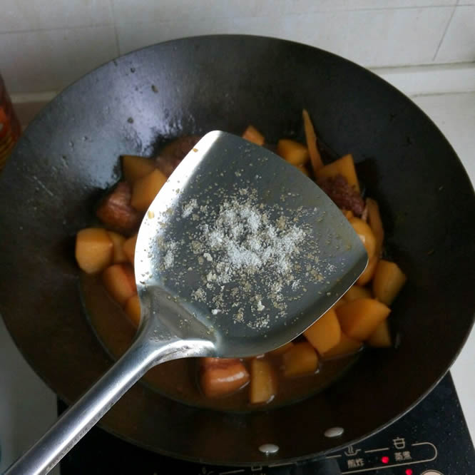 18炖到20分钟后转大火收汁,依个人口味加适量盐。收汁时要注意不停翻炒,以免火太大糊锅
