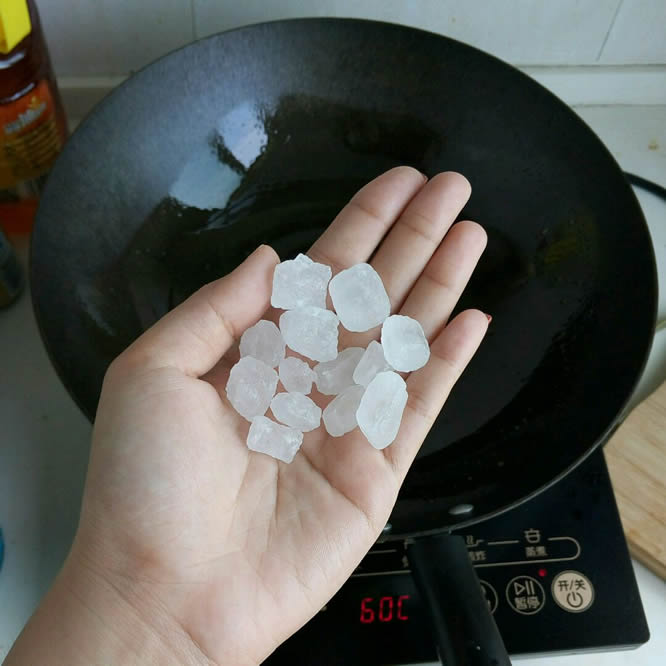 7热锅倒薄油,小火炒糖色,把冰糖放进去。爱吃甜一点可逐量增加