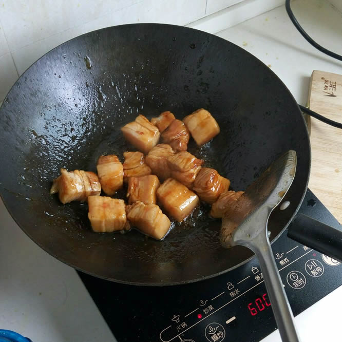 9 倒入五花肉快去翻炒,使其均匀裹上糖色