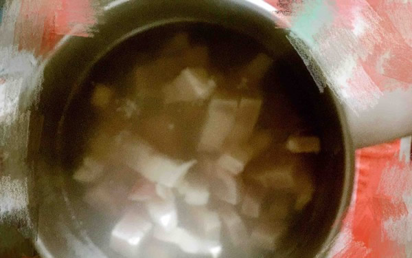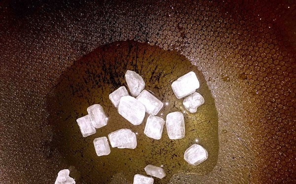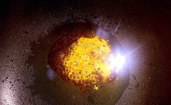5待冰糖炒成红色、冒泡,糖色就炒好了