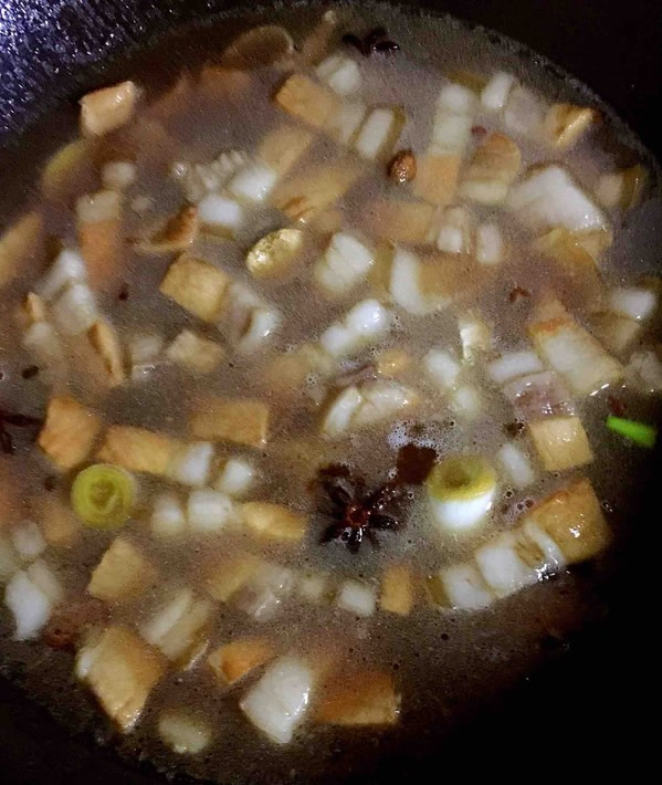 7 加料酒、酱油,放入葱段、姜片,大料,