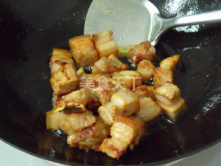 7煨到酥烂的五花肉,放冰糖大火收汁,晃动锅,不要翻动。