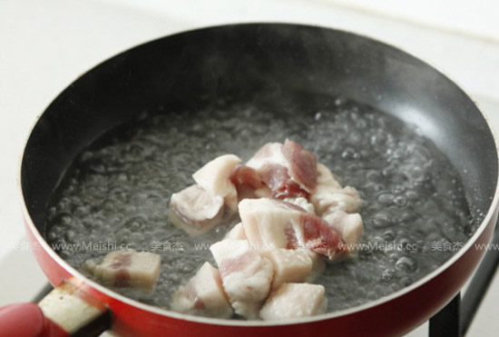 2把切好的肉放入冷水锅中,大火水开后继续煮2分钟捞出,用温水冲掉肉表面的浮沫,沥干水份