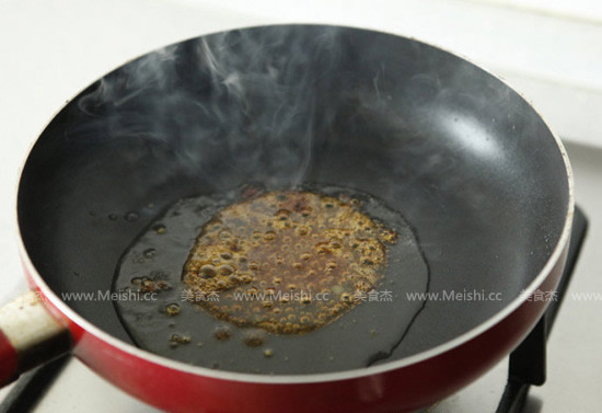 4慢慢炒到冰糖溶化变色呈枣红色,油中的大泡变成小泡,小泡快变没的时候,糖色就炒好了