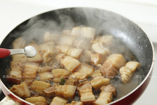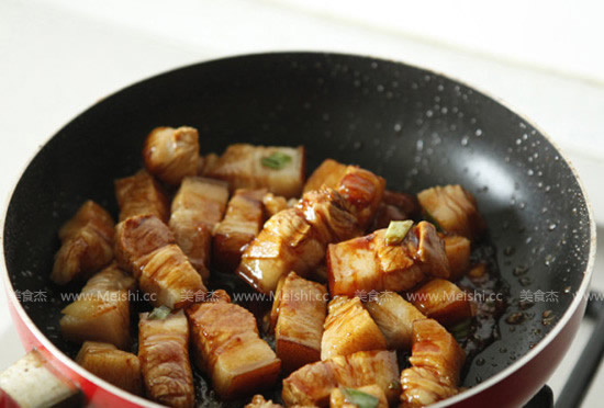 5马上把焯好的五花肉放入,迅速翻炒使肉的表面都裹上糖色;然后,倒入料酒、酱油、葱段和姜片翻炒均匀,加入适量的水没过五花肉,大火烧开后,转成小火,盖上盖子炖1个小时左右