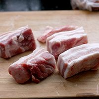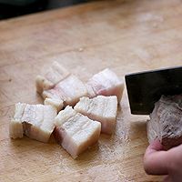 1带皮五花肉切大块。注意:一盘成功的红烧肉,选材很关键,选择五花肉时一定要选择带皮的,肥瘦适宜,层次分明的。所谓五花,就是一定要一层肥一层瘦,足有五层的才是好的五花肉,有的五花肉只有三层,肥的部分特厚,那都不是好的五花肉