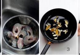 1 海鱼刨肚去肠清洗干净,葱切段,姜、蒜切片,五花肉切条